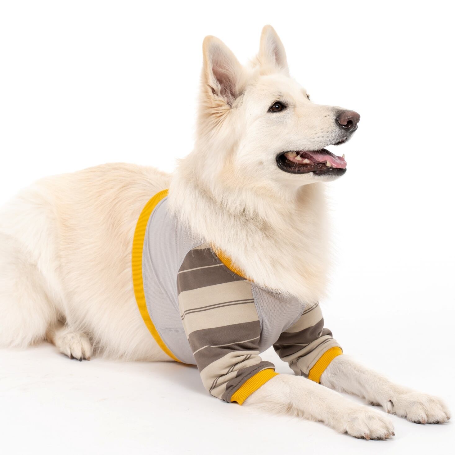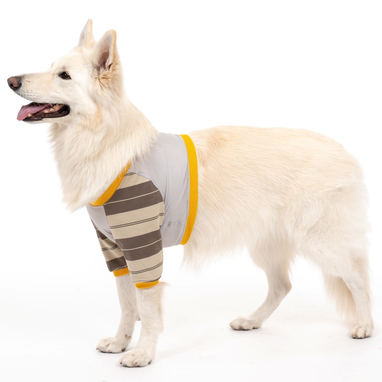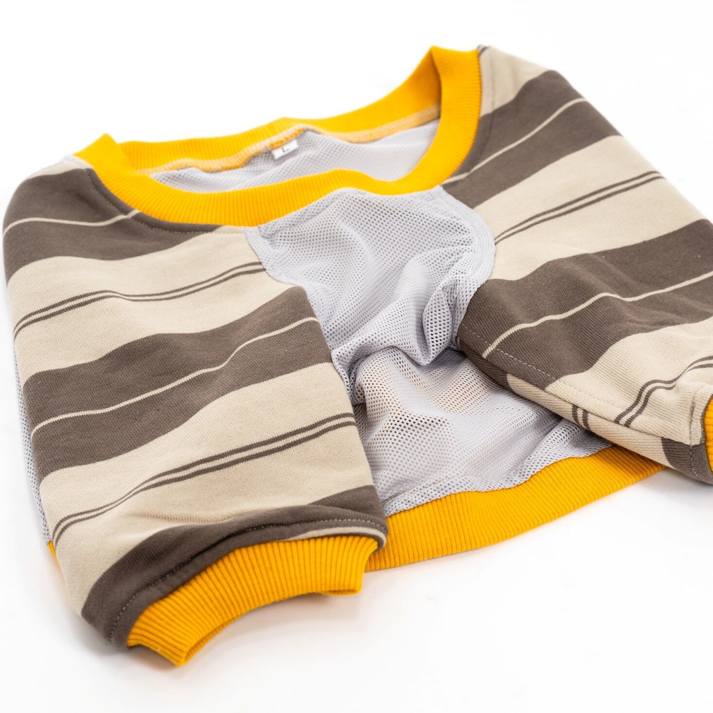 腕部分はベージュとブラウンのボーダー柄生地を採用し、胴部分は軽くて涼しいメッシュになっています。